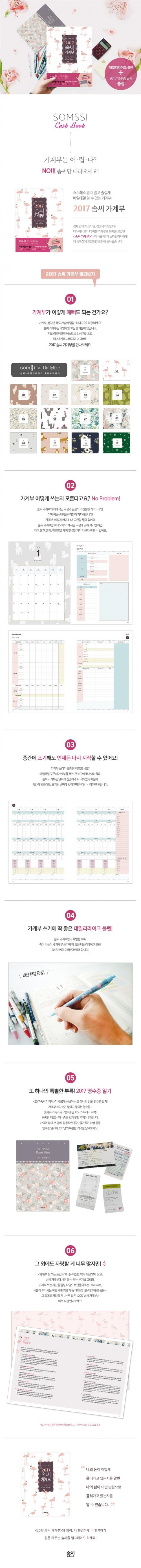 가계부 쓰는 습관이 똑똑한 자금 관리의 기본이 되는 것은 다들 잘 아는 사실. 하지만 하루 5분씩만 투자하면 되는 이 간단한 일을 ‘매일 꾸준히’ 실천하는 게 결코 쉽지가 않다. 그래서 누구나 쉽고, 즐겁게, 질리지 않고 꾸준히 쓸 수 있는 2017 솜씨 가계부 를 준비했다.